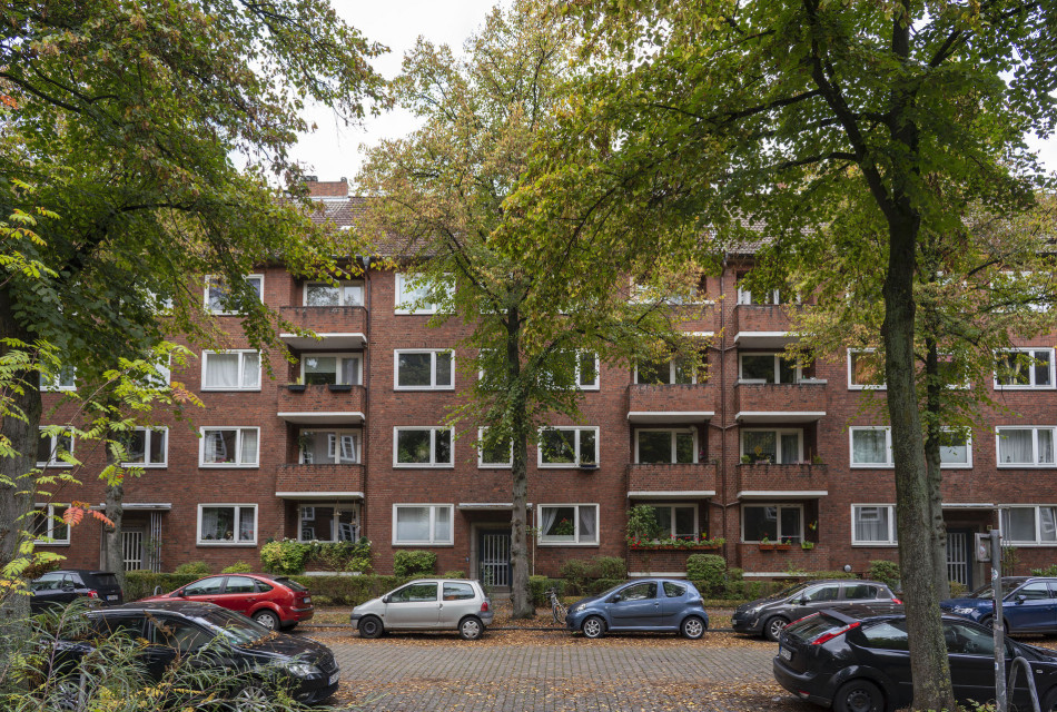 In Zentrumsnähe nur wenige Schritte vom S-Bahnhof Hasselbrook entfernt befindet sich die Wohnung in einem 4-geschossigen Backsteinbau mit rotem Satteldach. Das Grundstück grenzt an die S-Bahntrasse der S 4, die in diesem Bereich tiefer gelegt ist. Der Balkon liegt zur Straße. Viel Grünbezug.